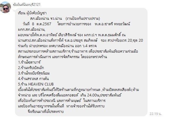 รายงานผลการปฏิบัติงานป้องกันปราบปราม เดือน ตุลาคม 2567 9 ตุลาคม 2567 โดย admin / ผลการดำเนินงานรายเดือน ผลการปฏิบัติงานประจำเดือน ตุลาคม 2567 วันที่ 24 ต.ค. 2567 โดยการอำนวยการของ พ.ต.อ.ชาตรี หทยะวัฒน์ ผกก.สภ.เมืองน่าน, พ.ต.ท.อาทิตย์ เลียวสิริพงศ์ รอง ผกก.ป.สภ.เมืองน่าน นำโดย พ.ต.ต.ธรรมศักดิ์ ณ น่าน สวป.สภ.เมืองน่าน ร.ต.อ.สุพจน์ เขียวสมบัตร รองสวป.สภ.เมืองน่าน (ร้อยเวร 20), สายตรวจรถจักรยานยนต์ ชุดที่ 1 - ออก ว.4 การรวมกลุ่มของกลุ่มวัยรุ่น ขับขี่ยานพาหนะ สร้างความเดือดร้อนรำคาญ แก่ประชาชน เพื่อป้องกันและปราบปรามการแข่งรถในทางสาธารณะ และความผิดอาญาอื่นๆในเขตพื้นที่รับผิดชอบตรวจยึดรถจักรยานยนต์ดัดแปลงสภาพรถ /เอกสารหลักฐานไม่ครบ/ไม่ติดแผ่นป้ายทะเบียน/ท่อรถเสียงดัง - จำนวน 3 คัน นำส่ง พงส.สภ.เมืองน่าน ดำเนินการตามกฎหมายต่อไป วันที่ 22 ต.ค. 2567 สายตรวจ จยย.123 ว.4 ตรวจป้องกันเหตุ ใต้สะพานภาคเหนือพัฒนา ตรวจค้น รถ จยย. ตรวจค้นแล้วไม่พบสิ่ง ผิดกฎหมาย ว่ากล่าว ตักเตือน เชื่อฟัง ให้กลับบ้าน วันที่(8 ต.ค.67)เวลา 21.00 น. พ.ต.ท.อาทิตย์ เลียวสิริพงศ์ รอง ผกก.ป.สภ.เมืองน่าน ร่วม กับฝ่ายปกครอง(นายอำเภอ) เทศบาลเมืองน่าน ออกตรวจสถานประกอบการที่คล้ายสถานบริการในพื้นที่ เหตุการณ์ปกติ Facebook iconFacebookTwitter iconTwitterLINE iconLine