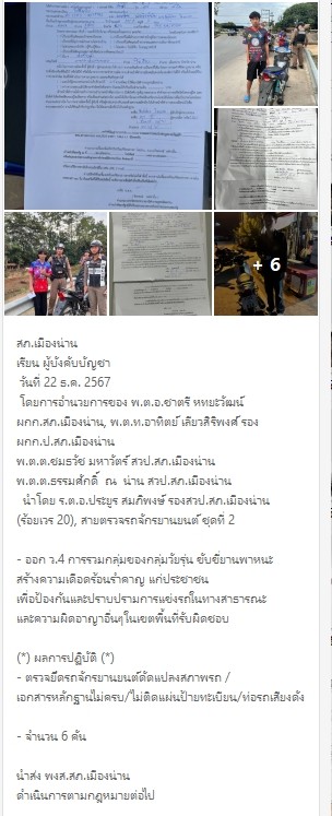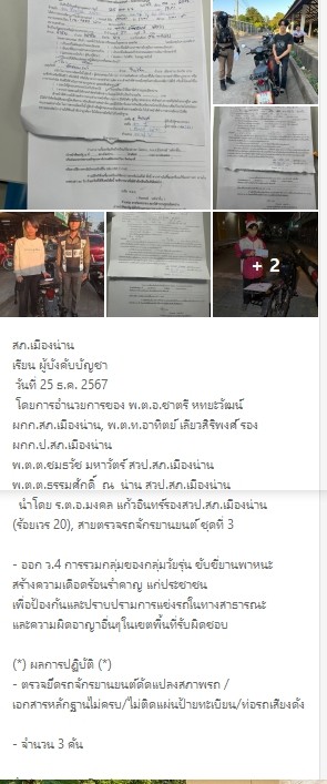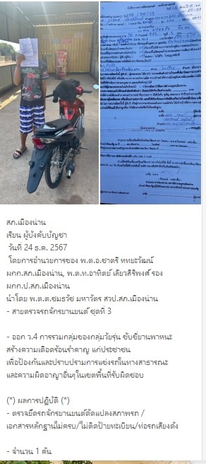รายงานผลการปฏิบัติงานป้องกันปราบปราม เดือน ธันวาคม 2567 29 ธันวาคม 2567 โดย admin / ผลการดำเนินงานรายเดือน ผลการปฏิบัติงานประจำเดือน ธันวาคม 2567 สภ.เมืองน่าน (เดือน ธ.ค. 2567) โดยการอำนวยการของ พ.ต.อ.ชาตรี หทยะวัฒน์ ผกก.สภ.เมืองน่าน, พ.ต.ท.อาทิตย์ เลียวสิริพงศ์ รอง ผกก.ป.สภ.เมืองน่าน พ.ต.ต.ชมธวัช มหาวัตร์ สวป.สภ.เมืองน่าน พ.ต.ต.ธรรมศักดิ์ ณ น่าน สวป.สภ.เมืองน่าน นำโดย ร.ต.อ.สุพจน์ เขียวสมบัตร รองสวป.สภ.เมืองน่าน (ร้อยเวร 20), สายตรวจรถจักรยานยนต์ ชุดที่ 2 - ออก ว.4 การรวมกลุ่มของกลุ่มวัยรุ่น ขับขี่ยานพาหนะ สร้างความเดือดร้อนรำคาญ แก่ประชาชน เพื่อป้องกันและปราบปรามการแข่งรถในทางสาธารณะ และความผิดอาญาอื่นๆในเขตพื้นที่รับผิดชอบ (*) ผลการปฏิบัติ (*) - ตรวจยึดรถจักรยานยนต์ดัดแปลงสภาพรถ /เอกสารหลักฐานไม่ครบ/ไม่ติดแผ่นป้ายทะเบียน/ท่อรถเสียงดัง - จำนวนรวม ๔๒ คัน นำส่ง พงส.สภ.เมืองน่าน ดำเนินการตามกฎหมายต่อไป Facebook iconFacebookTwitter iconTwitterLINE iconLine