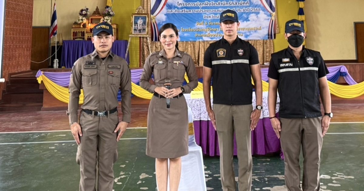 วันที่ 4 มีนาคม 2568 เวลา 13.30-16.30 น. โดยการอำนวยการของ พ.ต.อ.ชาญณรงค์ รัชตประทาน ผกก.สภ.เมืองน่าน , พ.ต.ท.สุรศักดิ์ มีเสาเรือน รอง ผกก.(สอบสวน) สภ.เมืองน่าน มอบหมาย ร.ต.ท.หญิง ฐิตพัฒน์ มัจฉพันธ์ รอง สว.(สอบสวน)สภ.เมืองน่าน พร้อมด้วย ส.ต.ต.ศรายุทธ พุฒทา ผบ.หมู่(ผช.พงส.)สภ.เมืองน่าน มาบรรยายให้ความรู้ เรื่อง การเสริมสร้างวิจารณญาณในการรับรู้ข้อมูลข่าวสารและการใช้สื่อโซเชียลมีเดียอย่างสร้างสรรค์ เพื่อความรักความสามัคคีปรองดอง ให้กับนักเรียน ระดับชั้น ม.1-ม.5 ในโครงการ ปลูกฝังจิตสำนึกรักสามัคคีและส่งเสริมความปรองดองสมานฉันท์ ณ โรงเรียนนันทบุรีวิทยา ในพระบรมราชานุเคราะห์ จังหวัดน่าน
