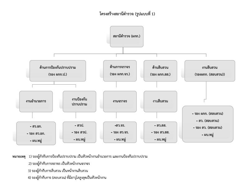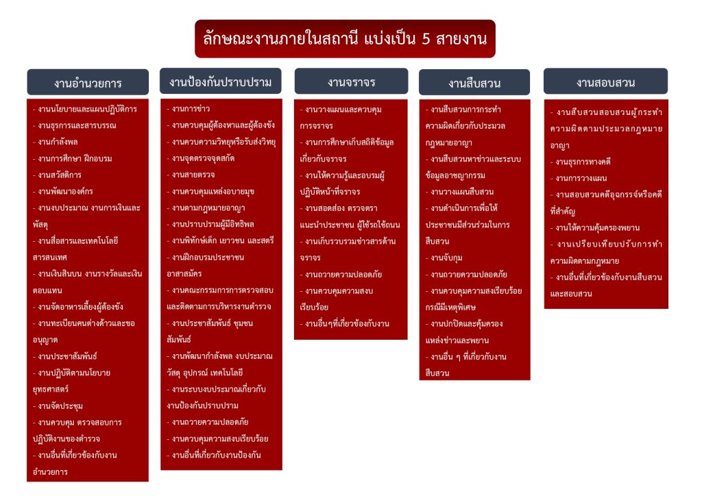 O1 โครงสร้าง และอำนาจหน้าที่ 5 มีนาคม 2567 โดย admin / ITA 68 คำสั่ง ตร.ที่537/2555 คำสั่ง ตร.ที่538/2555 พ.ร.บ.ตำรวจแห่งชาติ พ.ศ.2565 คำสั่ง มอบหมายให้ข้าราชการตำรวจปฏิบัติหน้าที่ (ภายใน) ของ สถานีตำรวจภูธรเมืองน่าน -ประจำเดือน มีนาคม 2568 -ประจำเดือน กุพภาพันธ์ 2568 -ประจำเดือน มกราคม 2568 -ประจำเดือน ธันวาคม 2567 -ประจำเดือน พฤศจิกายน 2567 -ประจำเดือน ตุลาคม 2567 1) งานอำนวยการ มีหน้าที่เกี่ยวกับการอำนวยการ การวางแผน การตรวจสอบติดตามและประเมินผลงานที่เกี่ยวกับนโยบาย ยุทธศาสตร์ และแผนงานของสถานีตำรวจ งานการบริหารบุคลากร งานจเรตำรวจงานกิจการพิเศษ งานความมั่นคง การศึกษา การฝึกอบรม งานวิชาการ สวัสดิการ การพัฒนา การบริหารจัดการ งบประมาณ การเงิน การพัสดุ การพลาธิการและสรรพาวุธ การส่งกำลังบำรุง รวมทั้งลักษณะงานอื่น ๆ ที่เกี่ยวข้องหรือเป็นส่วนประกอบของงานดังกล่าว เพื่อส่งเสริมหรือสนับสนุนการปฏิบัติงานของสถานีตำรวจ 2) งานป้องกันปราบปรามมีหน้าที่เกี่ยวกับการวางแผน อำนวยการ สั่งการ ควบคุม กำกับ ดูแล ตรวจสอบติดตามและประเมินผล ตลอดจนปฏิบัติงานในด้านการป้องกันอาชญากรรมและรักษาความสงบเรียบร้อยงานคณะกรรมการตรวจสอบและติดตามการบริหารงานตำรวจ งานชุมชนและมวลชนสัมพันธ์ในรูปแบบต่าง ๆ รวมทั้งงานที่มีลักษณะเกี่ยวข้องหรือเป็นส่วนประกอบของงานนี้ เพื่อมิให้เกิดอาชญากรรมขึ้นในเขตอำนาจ การรับผิดชอบหรือพื้นที่ปกครองของสถานีตำรวจ 3) งานจราจรมีหน้าที่เกี่ยวกับการวางแผน อำนวยการ สั่งการ ควบคุม กำกับ ดูแล ตรวจสอบและประเมินผลงานด้านการควบคุมจราจร จัดการและบังคับใช้กฎหมายเกี่ยวกับจราจร งานจราจรตามโครงการพระราชดำริ รวมทั้งงานที่มีลักษณะเกี่ยวข้องหรือเป็นส่วนประกอบของงานนี้ เพื่อป้องกันไม่ให้เกิดปัญหาด้านการจราจร ในเขตอำนาจการรับผิดชอบหรือพื้นที่ปกครองของสถานีตำรวจ ตลอดจนพื้นที่ที่มีการจราจรต่อเนื่องกัน 4) งานสืบสวน มีหน้าที่เกี่ยวกับการวางแผน อำนวยการ สั่งการ ควบคุม กำกับ ดูแล ตรวจสอบติดตามและประเมินผล ตลอดจนปฏิบัติงานในด้านการสืบสวน อาชญากรรม การกระทำความผิดตามพระราชบัญญัติที่มีโทษทางอาญาทุกฉบับ ตลอดจนองค์กรหรือเครือข่ายที่อยู่เบื้องหลัง รวมทั้งงานที่มีลักษณะเกี่ยวข้องหรือเป็นส่วนประกอบของงานนี้ เพื่อมิให้เกิดอาชญากรรมขึ้นในเขตอำนาจการรับผิดชอบหรือพื้นที่ปกครองของสถานีตำรวจ 5) งานสอบสวน มีหน้าที่เกี่ยวกับการวางแผน อำนวยการ สั่งการ ควบคุม กำกับ ดูแล ตรวจสอบติดตามและประเมินผลด้านการสอบสวนคดีอาญา การมีความเห็น การให้ความเห็นชอบ หรือเป็